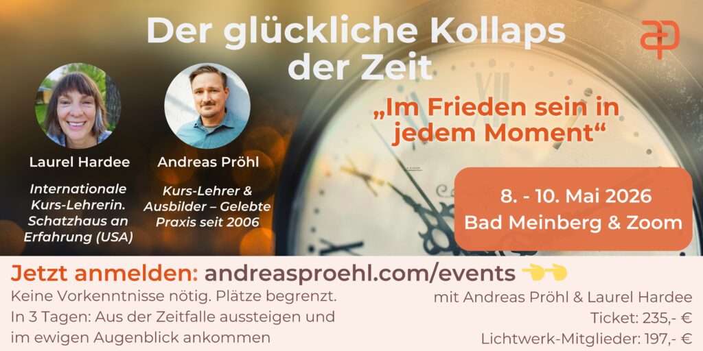 * Die in diesem Event vorgestellten Inhalte stellen nur die persönliche Erfahrung und Verständnis der Vortragenden dar und können von denen der Rechteinhaber oder anderer Praktizierender abweichen. Ein Kurs in Wundern ist im Greuthof Verlag erschienen. Alle Zitate stammen aus Ein Kurs in Wundern ©2006 von der Foundation for Inner Peace, 448 Ignacio Blvd., No. 306, Novato, CA 94949, acim.org und info@acim.org, verwendet mit Erlaubnis.